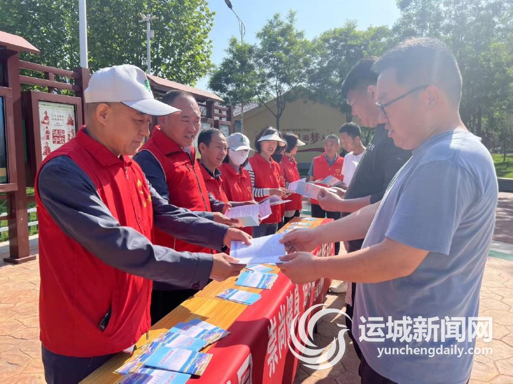上图是4月27日,市体育公园志愿者在向市民发放和讲解《运城市民文明手册》,传播新风尚,引导文明游园。 赵 翔 摄