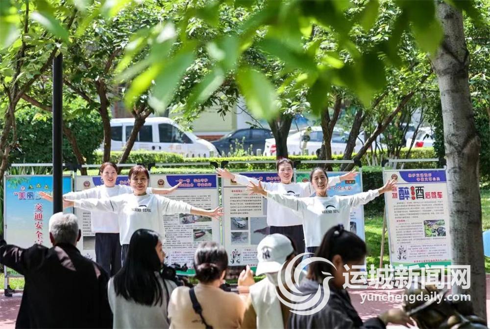 “最美的速度最文明,最美的出行一路顺风……”一曲欢快的广场舞《最美出行》吸引游玩群众加入宣传活动。当天,永济交警大队创新交通安全宣传形式,使交安知识在欢声笑语中得以深入人心。