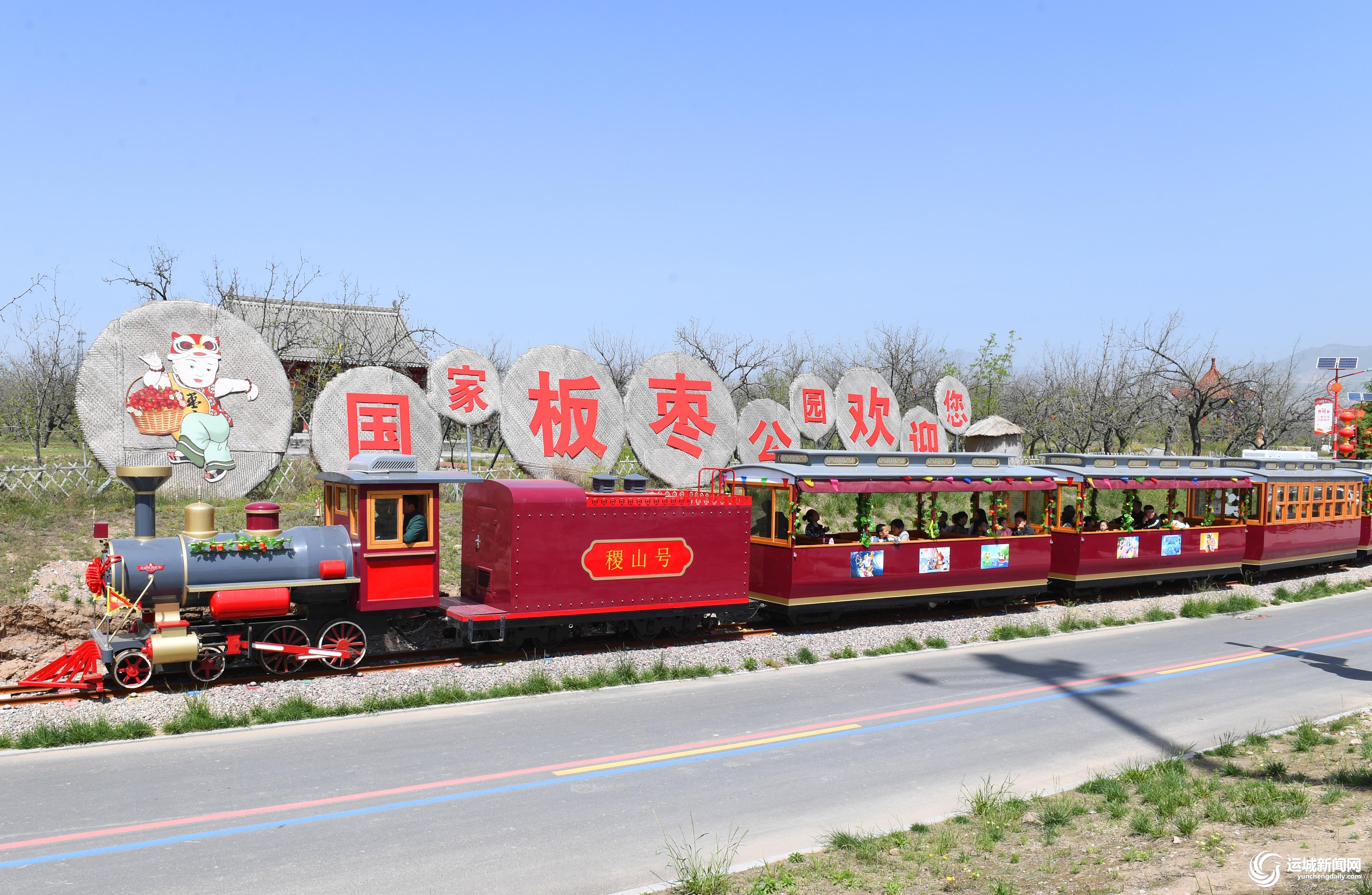 ▲游客在稷山国家板枣公园乘坐特色小火车欣赏千年枣林风光。“五一”期间,稷山县推出了多条特色旅游线路,让群众在“家门口”乐享文旅盛宴。