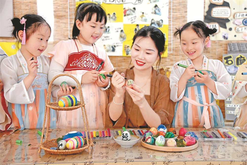 5月5日,浙江省台州市仙居县中心幼儿园的小朋友在老师的指导下绘立夏彩蛋。