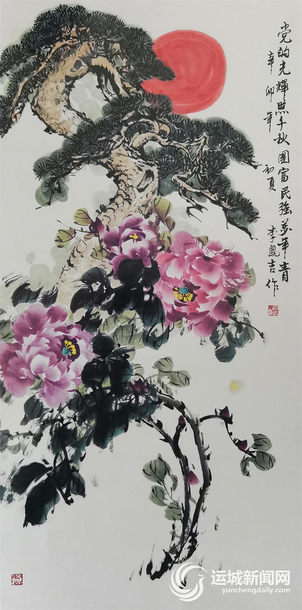 在他出版的专辑《李凤吉写意牡丹画集》一书中,有一幅《党的光辉照千秋 国富民强万年青》的作品。该作品以牡丹打底,牡丹之上绘有青松,青松之上一轮红日。“红日、青松象征着我党历经百年风雨,依然风华正茂;牡丹则寓意党的领导下,国泰民安,人民群众的生活越来越好。”