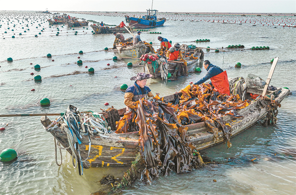 5月8日,在山东省荣成市爱伦湾海域海带养殖区,渔民采收海带。