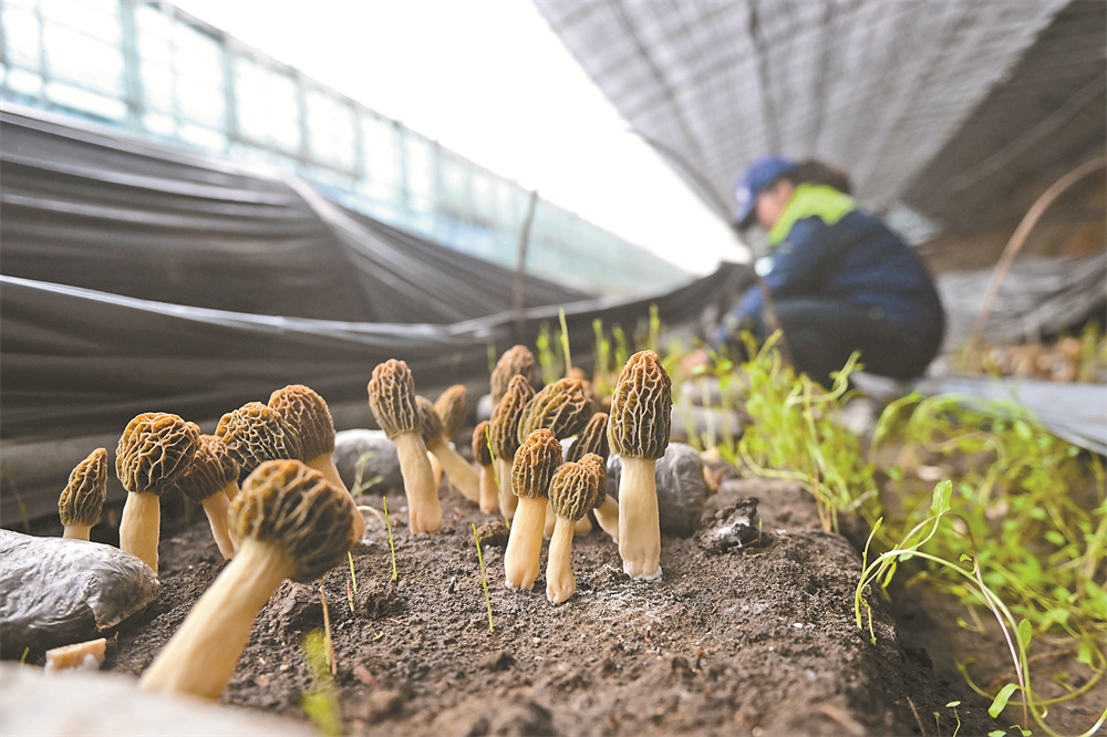 5月10日,在青海省西宁市大通回族土族自治县景阳镇的设施温棚内,青海卓辰农业科技发展有限公司工作人员在采摘羊肚菌。