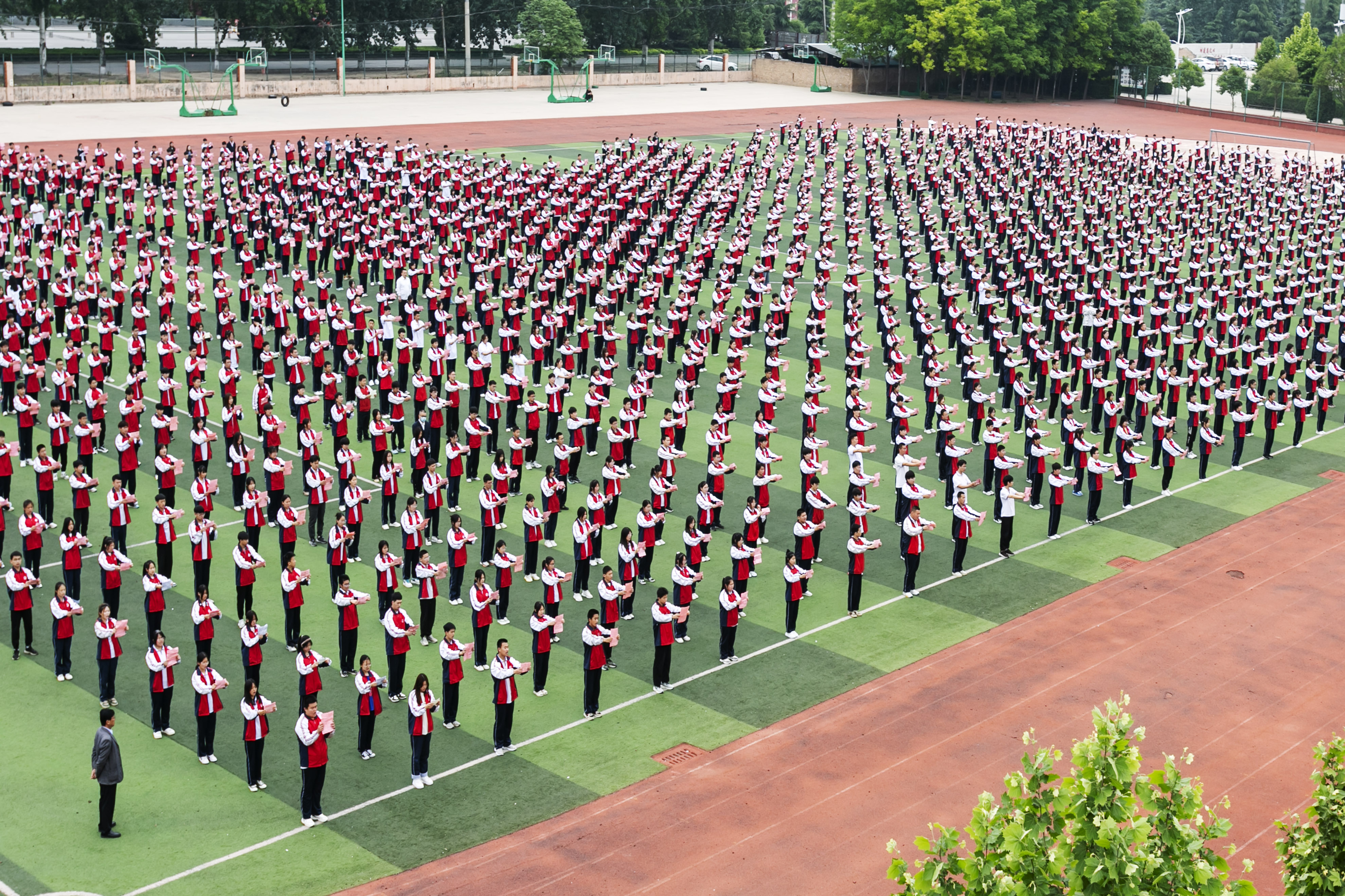 5月10日,在盐湖中学的操场上,学生们做课间操时集体诵读《大学》。