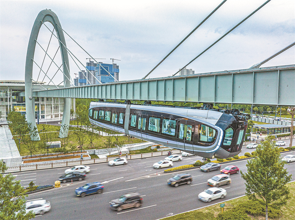 空轨,专业名称为“悬挂式单轨列车”,是一种新型中低运量轨道交通制式。空轨列车车体悬挂于轨道梁下方凌空“飞行”,被称为“空中列车”。它具有不占用地面路权、环境适应性强等优点,兼具通勤和观光功能。 新华社记者 肖艺九 摄