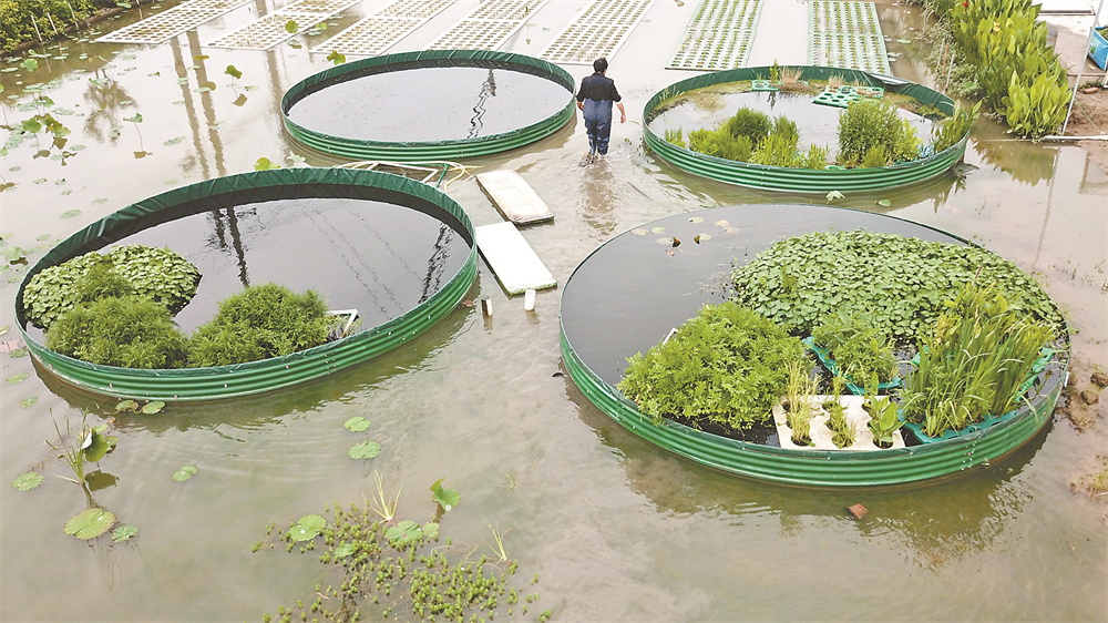 5月11日,在湖南省长沙市望城区高塘岭街道湘江村,农民打理水上种植的水稻、蔬菜、花卉。近年来,当地利用“水上种植”技术,使鱼虾与水稻、蔬菜、花卉在池塘共生互补,助力农民增产增收。 新华社记者 陈泽国 摄