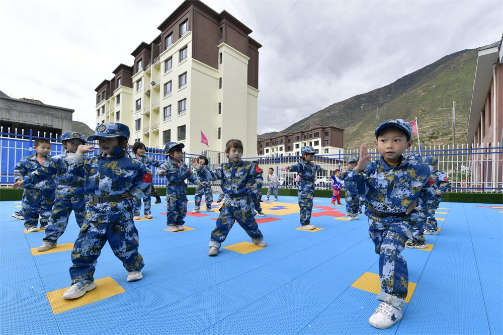 5月9日,在甘肃省陇南市宕昌县沙湾镇生态及地质灾害避险搬迁安置房旁的新起点幼儿园,孩子们在户外上课。 甘肃省2022年启动生态及地质灾害避险搬迁工作,截至2023年4月,完成4.5万余户、17万余人的搬迁安置任务。搬迁群众告别地质灾害,搬进安全舒适新家,生活环境得到极大改善。 甘肃是我国生态最脆弱的地区之一,地质灾害高发易发区域超过全省面积的50%,受威胁人口243.27万人。根据《甘肃省生态及地质灾害避险搬迁实施方案(2022—2026年)》,甘肃省计划分两期搬迁地质灾害威胁区、河湖管理范围、地震灾害危险区、生态敏感区、自然保护地核心保护区、饮用水水源地一级保护区6类范围的26.43万户、103.95万人。