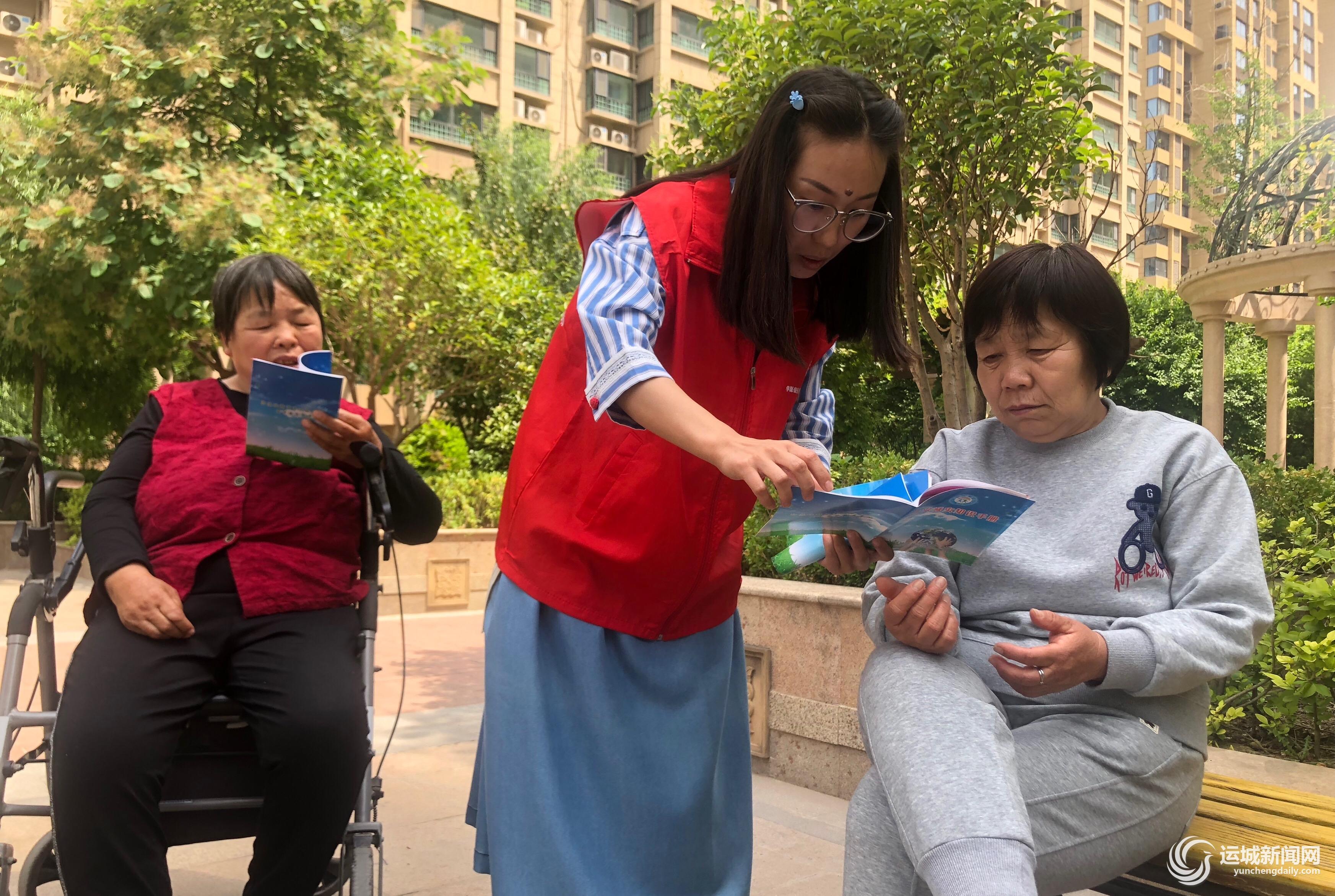 ▲5月12日,盐湖区姚孟街道华源豪庭社区工作人员(中)向辖区居民普及防灾减灾知识。