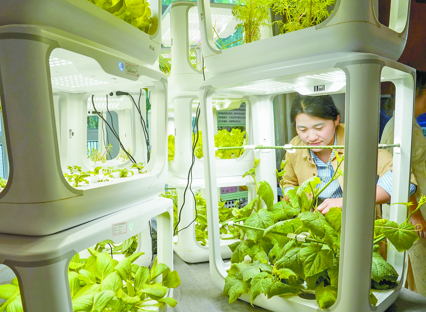 ▲上海农林职业技术学院的教师展示智能种植箱里的绿植 新华社记者 刘颖 摄