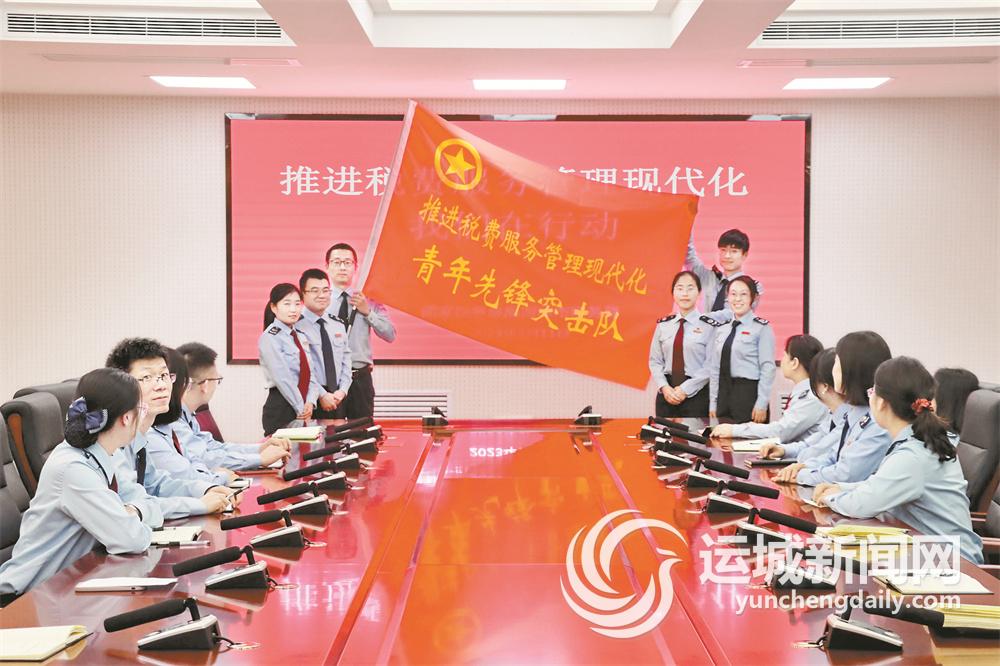 ▲市税务局在推进县级税务局税费服务管理现代化改革中成立“青年先锋突击队”。图为“青年先锋突击队”授旗仪式现场。