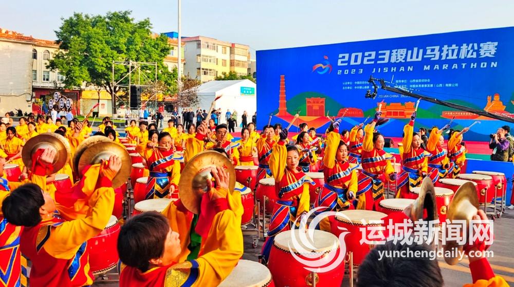 5月14日,稷山“五月风”锣鼓队在2023稷山马拉松赛起跑仪式上表演。