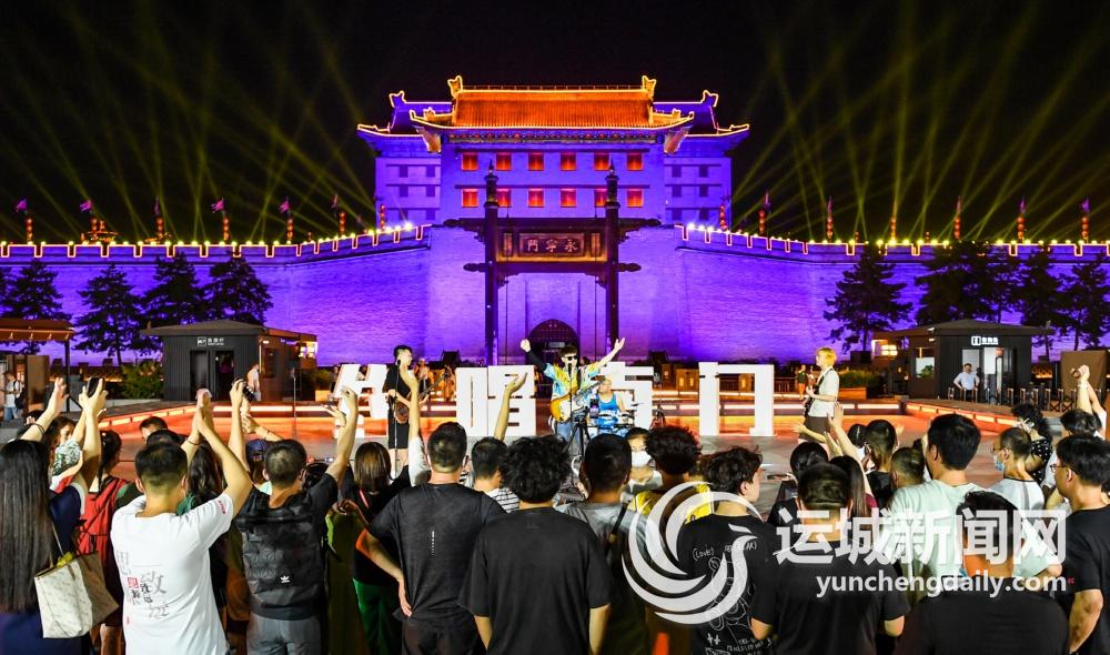 游客在西安城墙永宁门广场欣赏乐队演出(2022年8月1日摄)。