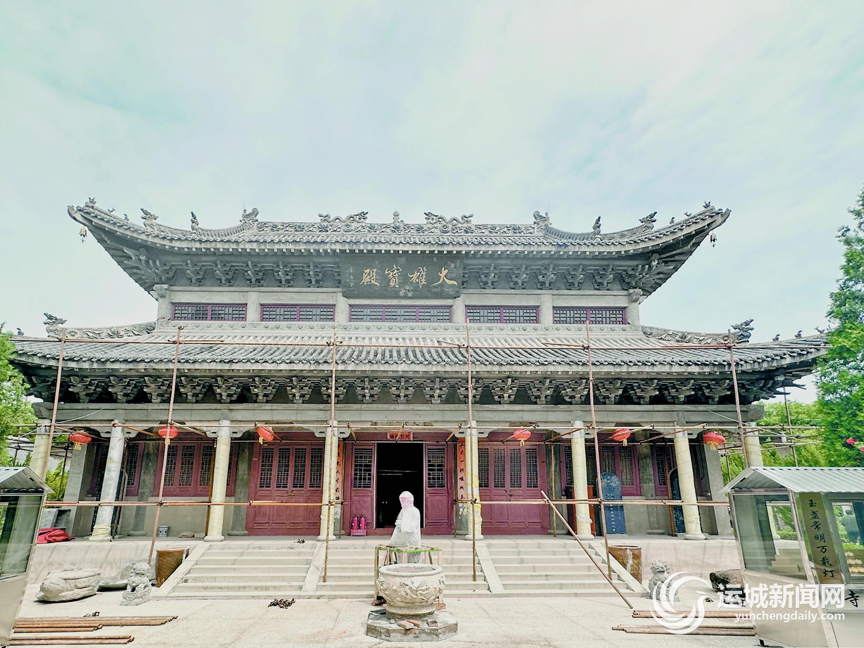 穿过山门,面前的大雄宝殿宏伟气派,外面搭建了一圈铁架,适逢夏县文物部门聘请的湖北专家在对大殿进行彩绘。
