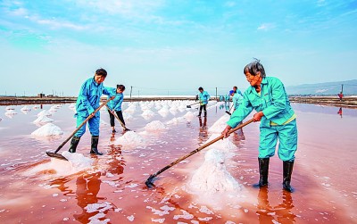 工人在运城盐湖铲收原盐。薛俊摄/光明图片