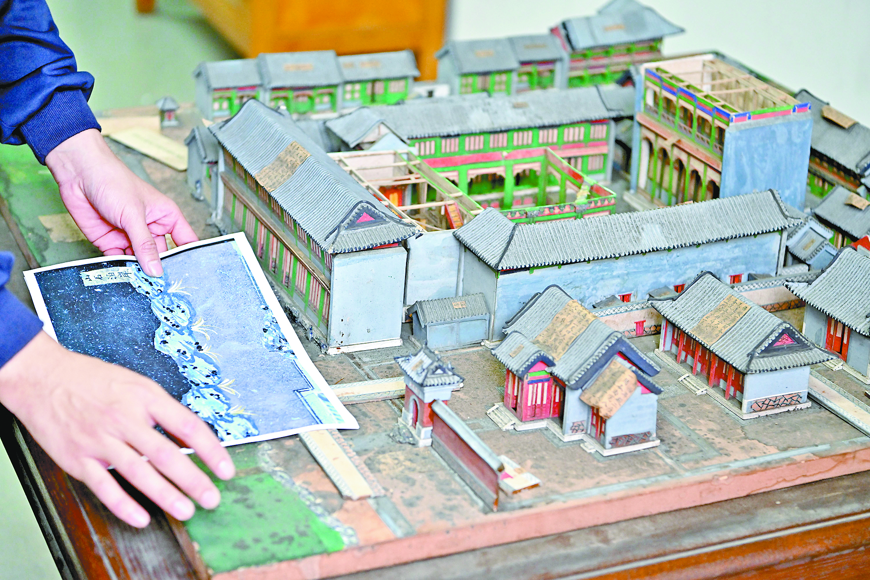▲5月16日,国博文保院修复师向媒体记者介绍圆明园同乐园建筑群样式雷烫样文物材质、构造等内容。