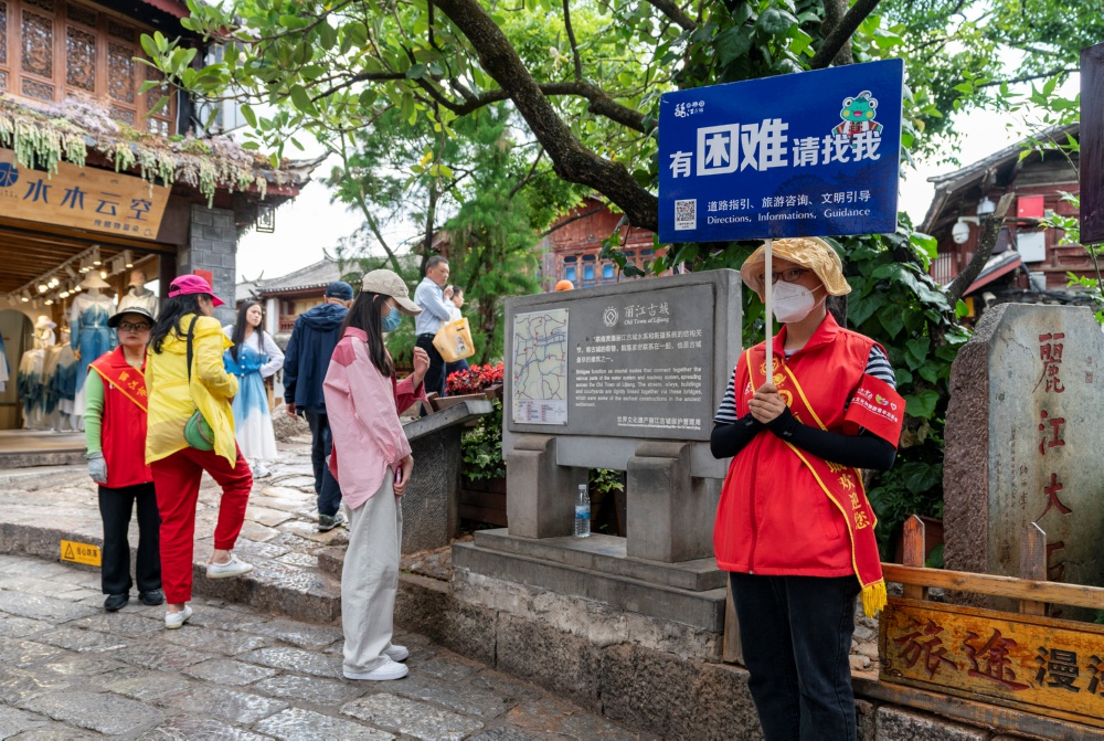 5月18日,一名志愿者(右)在丽江古城一处志愿服务点值守。