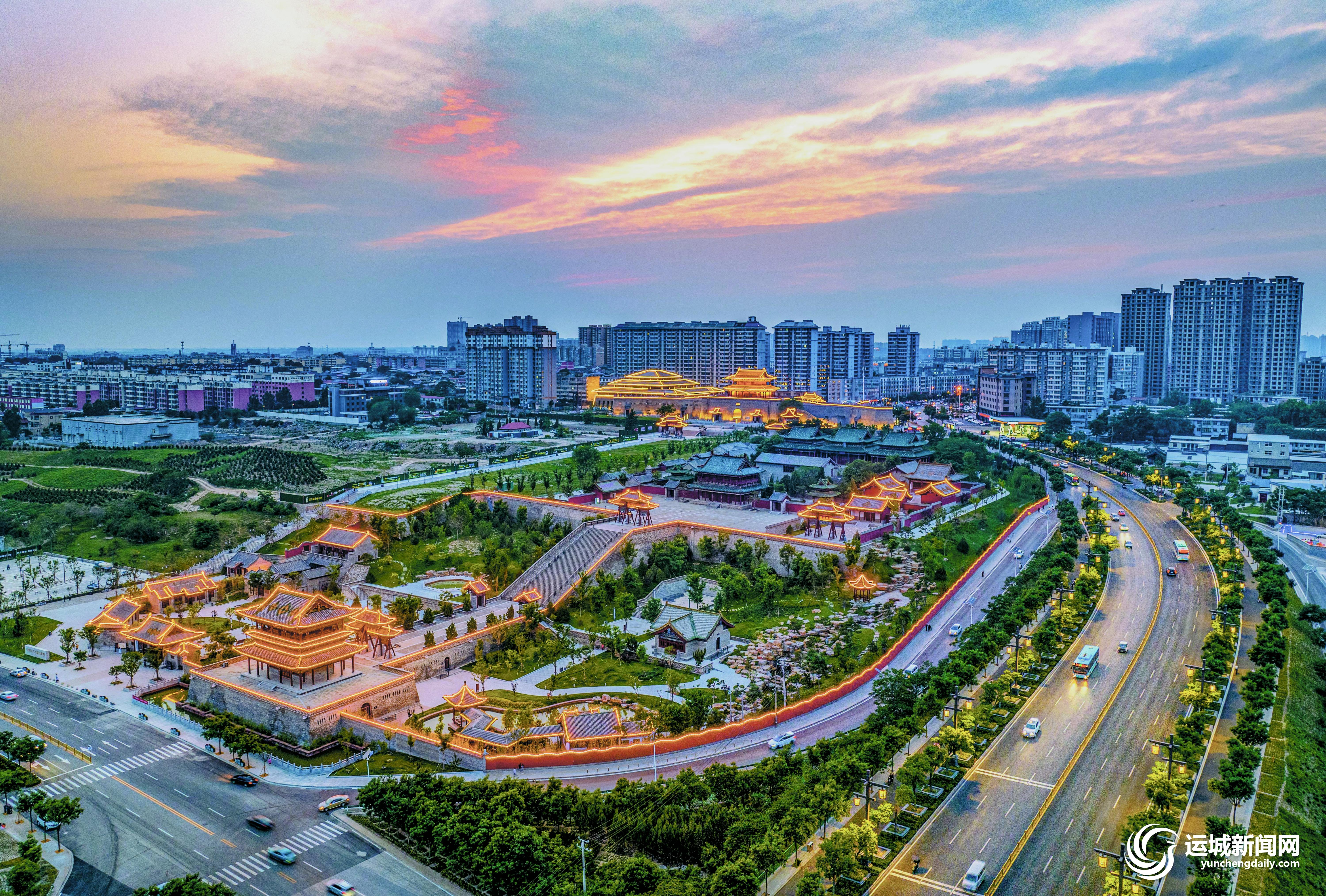 ▲5月19日在市区拍摄的夕阳下的河东池盐博物馆。连日来天气晴朗,每到傍晚时分,河东池盐博物馆亮起的灯带、跨湖大道流动的车灯与绚丽的夕阳交相辉映,从空中俯瞰,美不胜收。 记者 薛俊 摄