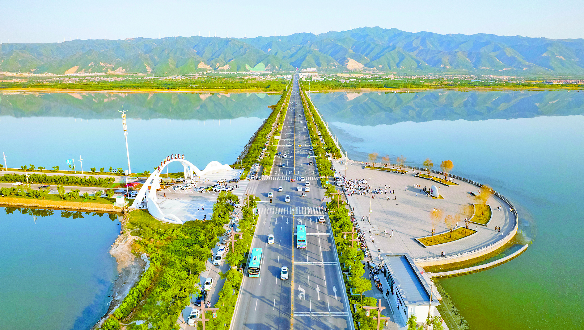如今,漫步在盐湖的环湖绿道上,湖水清澈、湖边植物茂盛,成群的飞鸟在湖面上嬉戏,“非水即绿”正成为盐湖区域的新景致。