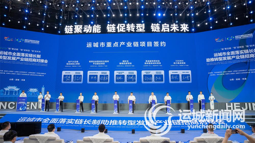 项目固链,催生产业集聚。此次产业链招商对接会共签约重点产业链项目28个,签约总金额达351.1亿元。其中,现场签约10个,签约金额达289.2亿元,项目涉及碳基新材料产业链、特色制造产业链、生物医药大健康产业链、新能源汽车产业链、铝精深加工产业链。当天,河津市的签约项目有动力电池生产、高温超导带材及纳米粉体材料制备、煤矸石综合利用、铝镁合金型材料交易所平台建设和铝压延加工5个项目。
