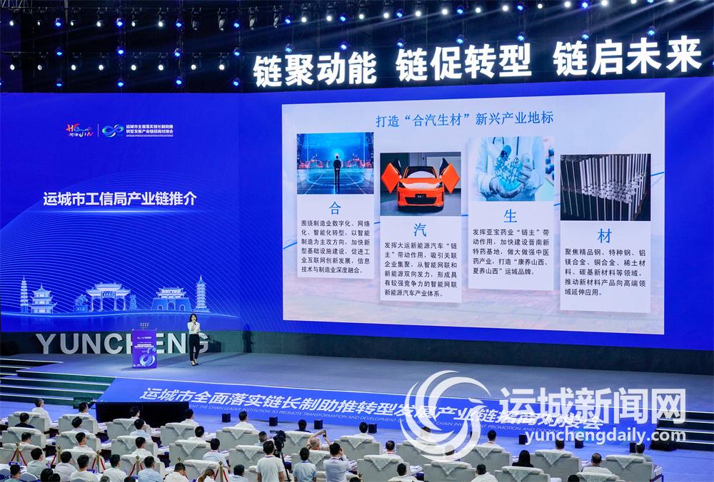河津市委副书记、市长王云在会上发布了河津市支持重点产业链发展相关政策。近年来,河津市认真贯彻落实省、市重点产业链和专业镇培育重大决策部署,坚持政策引领、科技创新、金融助力、人才支撑四措并举,建立“五个一”工作机制,在严格落实省市政策措施基础上,围绕培育壮大“链主”企业、促进产业链项目落地、打造特色专业镇、强化科技赋能、加大金融助力5个方面,配套出台了22条具体激励政策,全方位促进重点产业链高质量发展。