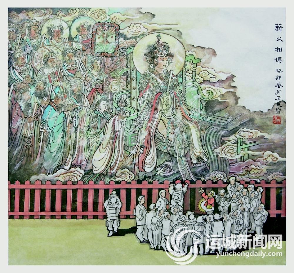 《薪火相传》是运城本土画家石民岗的作品。该作品根据石民岗的亲身经历所作。作品的画面构成,是以永乐宫壁画打底,一群人在壁画前参观、聆听讲解。“如果仅仅就是这样一幅参观的画面,是很难脱颖而出的,它的画龙点睛之处,就是那个身怀六甲的讲解员。”刘曼华说,“作者对怀孕的讲解员进行了特殊处理,‘薪火相传’的意味就浓了。”