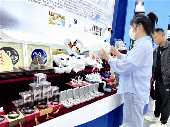 5月22日,在第九届中国特色商品博览交易会上,湖滨专区推出的文创产品吸引了众多游客的目光。其中,毛茸茸的白天鹅玩偶、可爱的白天鹅摆件、萌萌的白天鹅首饰和挂件等,俘获了许多女孩的“芳心”。图为一名游客在认真挑选白天鹅玩偶。 本报记者 吴若雨 摄