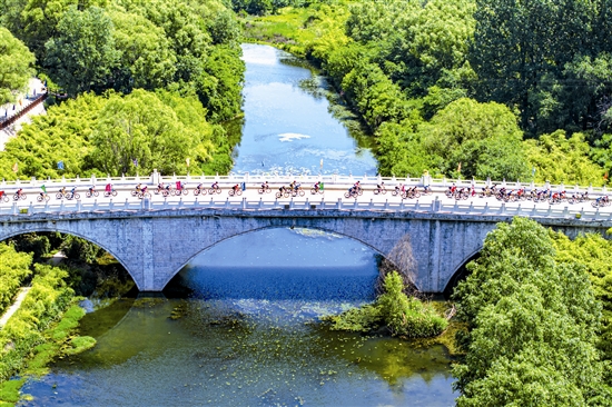 自行车运动员通过苍龙湖拱桥。 本报记者 杜杰 摄