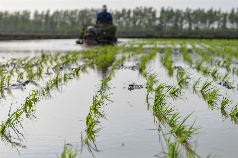 5月24日,农民在吉林省长春市九台区龙嘉街道红光村操作农机进行水稻插秧。