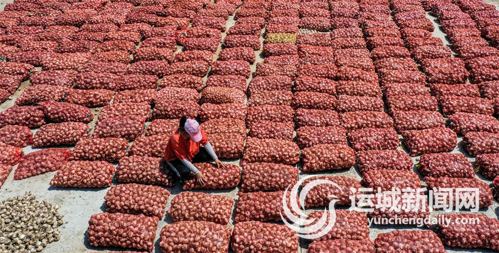 5月24日,在夏县南大里乡夏鲜蔬菜基地,菜农在整理装袋的大蒜。