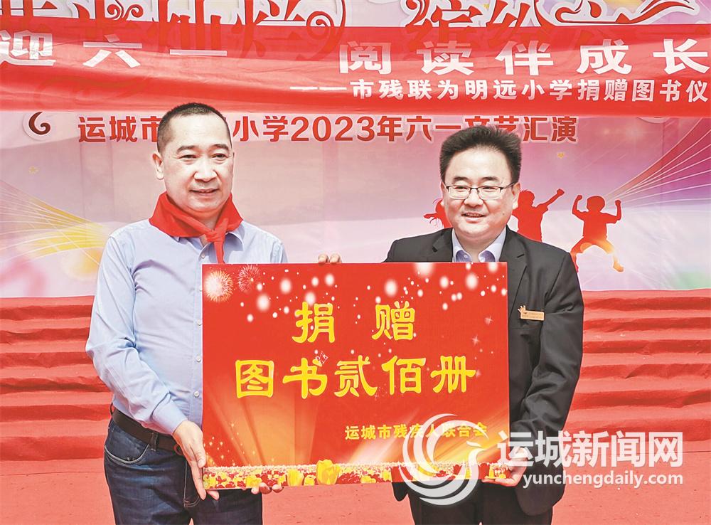 运城晚报讯(记者 郝丽莎)5月25日,市残联向运城市明远小学捐赠200册励志图书,为孩子们送上精神文化大餐(上图)。