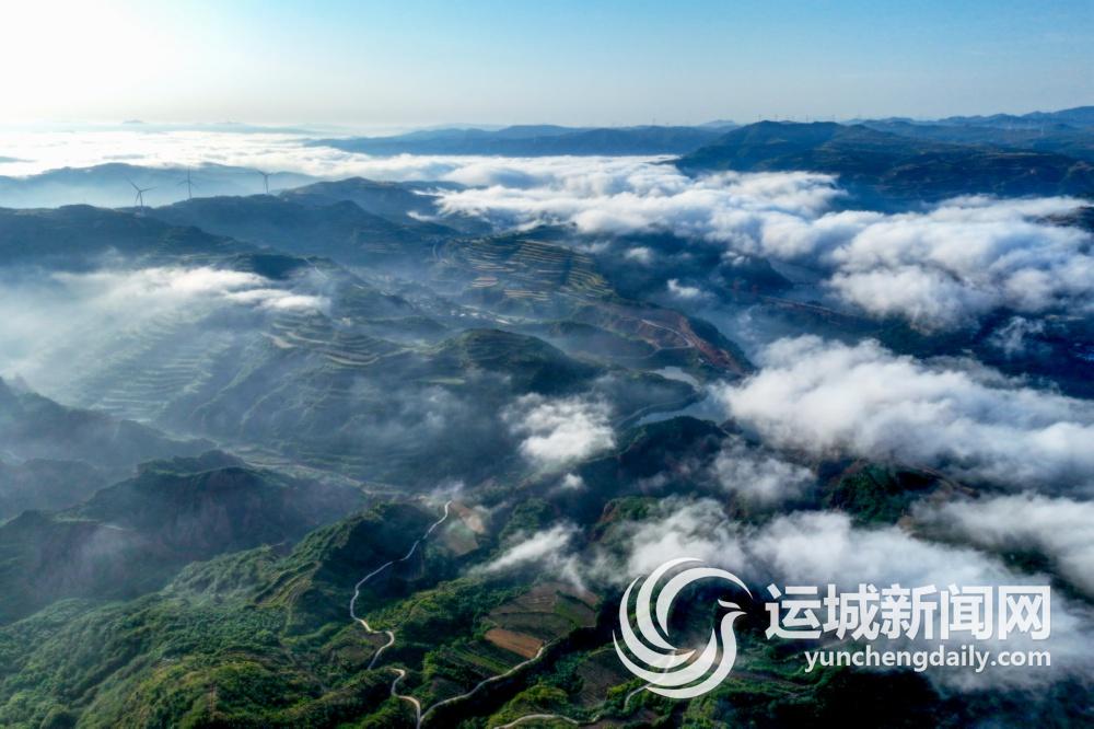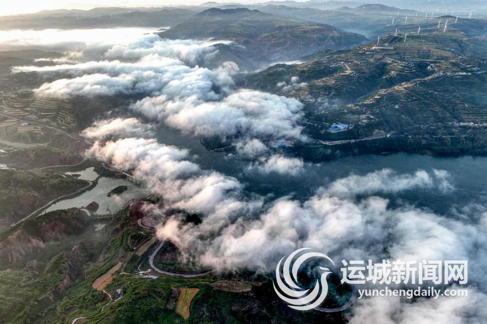 最近一段时间雨天较多,位于黄河岸边的平陆县一带出现云海景观,山峰、梯田在云海中时隐时现,河面上的云海似一条舞动的长龙。云海之上碧空如洗,丽日,蓝天,白云,绘就了一幅山水画卷。
