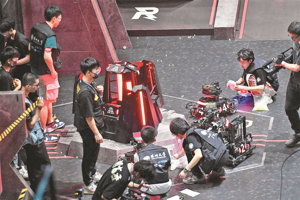 ▲5月28日,深圳大学RobotPilots战队队员在比赛间隙调整机器人。