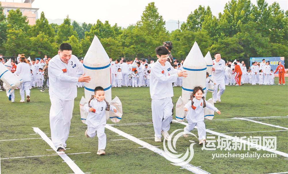 ▲6月1日,夏县示范幼儿园开展“童心向未来 点燃航天梦”大型航天科技主题亲子活动,2000余名幼儿、家长和老师组成“中国神舟”“嫦娥”“玉兔”方队,进行了《载人火箭》《遨游太空》等趣味游戏。父母陪伴孩子“遨游太空”欢度“六一”,激发了孩子们对航天事业的兴趣。