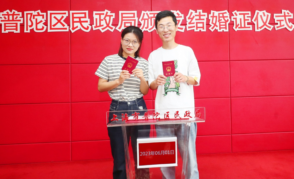 老家在江苏淮安的新人刘先生和袁女士6月1日按照预约时间准时来到了上海市普陀区婚姻收养登记中心,顺利地领到了结婚证。
