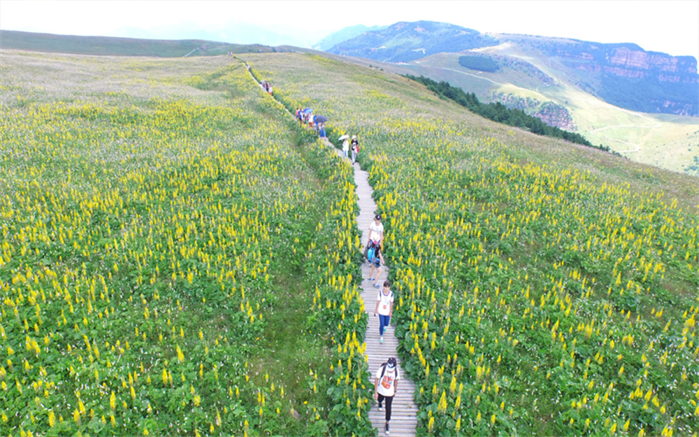 “不登舜王坪,焉知草木情。”奇花异草是舜王坪的生命和灵魂,更是历山的一张亮丽名片。历山舜王坪有面积5400余亩的华北地区最大的可观赏性亚高山草甸,有“云中草原”之美誉。“亚高山草甸”是高寒草甸一种类型,以密丛短根茎,杂类草及苔草为草甸群落。主要分布在我国西部高山及青藏高原,并有华丽的外貌。历山贵在奇花异草,争奇斗艳。花草三月返青,五月含苞,七月怒放,八月汪洋。花儿随季节由白而黄,由黄而红,由红而蓝,由蓝而紫。人若行走在坪顶眺望四周,起伏的山峦如点缀在绿色海洋中的座座小岛,随波荡漾,蔚为壮观;俯视脚下,延绵的草甸又像从天宫飘落的地毯,繁花似锦,风光无限。每逢月半夜晚可赏风邀月,只见玉兔东升,苍穹一碧如洗,天上繁星闪烁,大地碧草喷香。若雨后初晴,云海翻腾,排山倒海,佛光彩虹若隐若现,似仙境,如琼阁。“南天门”东侧是“斩龙台”,这里的土石均系血红色,还散发出股股血腥味。传说有一年大旱,舜王上奏玉帝,玉帝派小龙王下界降雨,吩咐多下一会儿细雨。但小龙王急着与情人怀姑约会,暴雨匆匆下落,结果把历山冲刷得千沟百壑。舜王大怒,在此斩了小龙王。怀姑见情人被斩,变成一棵小树,被今天的人们称为“情人树”,千百年后依然顽强地生长在这里,守护着当初的爱情。“斩龙台”南下,“千层饼”迎面而来。此处的千层叶岩和下边的“沽漯汤坡”,贯穿着一个优美的“舜试二妻”的故事:一日舜给二妻每人三根麻秆,测试二妻谁能先做好饭菜。娥皇机灵,先擀面再点麻秆烧火,第一根炒了菜,第二根烙了饼,第三根煮了面,大事告成。而女英先点燃麻秆,水开了和面,面没和好,麻秆已着完,干脆把面絮倒入锅里,做成沽漯汤。由于女英后于姐姐,慌忙中又摔了一跤,一罐饭化作了沽漯汤坡。一巧一拙,一饼一汤,妙趣横生。这里四周都是森林,中间却有了白色石块。它的真正形成原因,一是地震说,二是第四纪冰川说。但二说均不能自圆,实乃谜中之谜。
