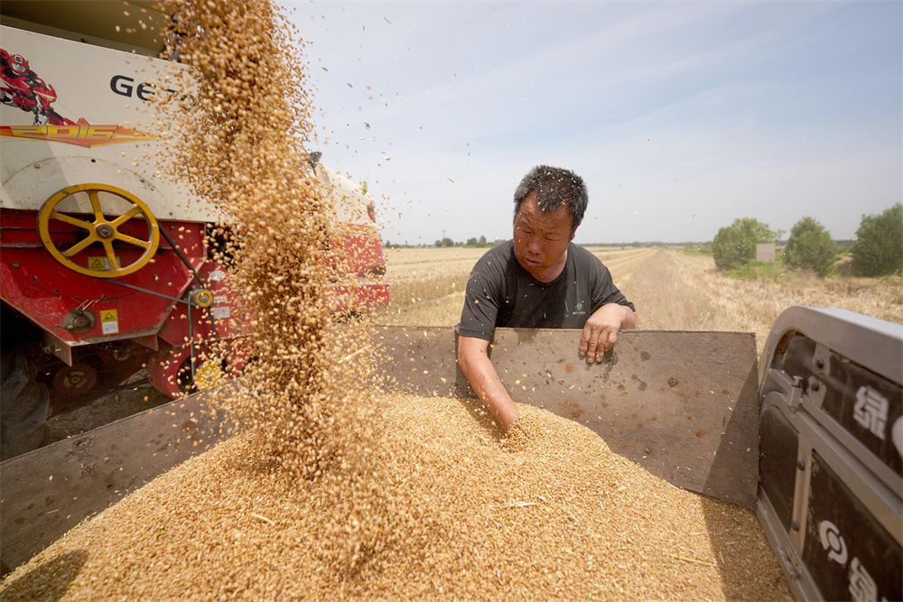 6月5日,农民在河北省沙河市下郑村的麦田里将收获的小麦装车。