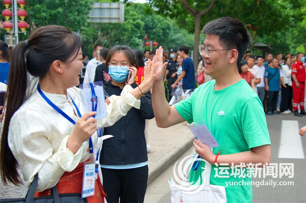 6月7日,在市区运城中学考点,2023年高考首门科目考试结束后,一名考生脸上洋溢着笑容,与老师击掌。 记者 朱超逸丁 摄