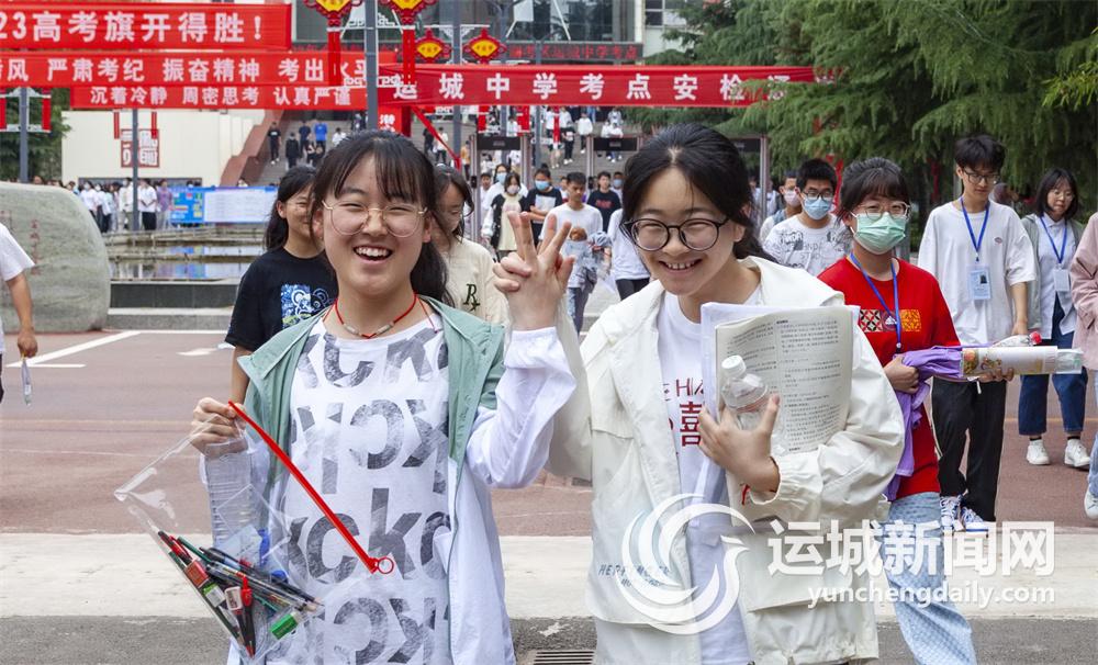 6月7日,在运城中学考点,两名考生走出考场后带着自信的笑容比出胜利手势。当天是2023年普通高校招生全国统一考试首日,考试科目为语文、数学。 记者 茹雅 摄