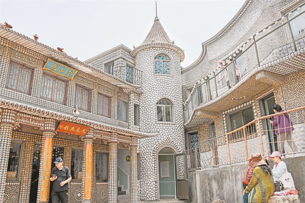 山东省青岛市灵山岛上有一座用各种贝壳装饰而成的“贝壳楼”,该建筑外墙、屋顶以及部分地面均采用贝壳装饰、镶嵌,其覆盖面积约1500平方米。据介绍,“贝壳楼”始建于1986年,历时20多年逐步完善而成。许多游客前来观光打卡。 新华社记者 李紫恒 摄