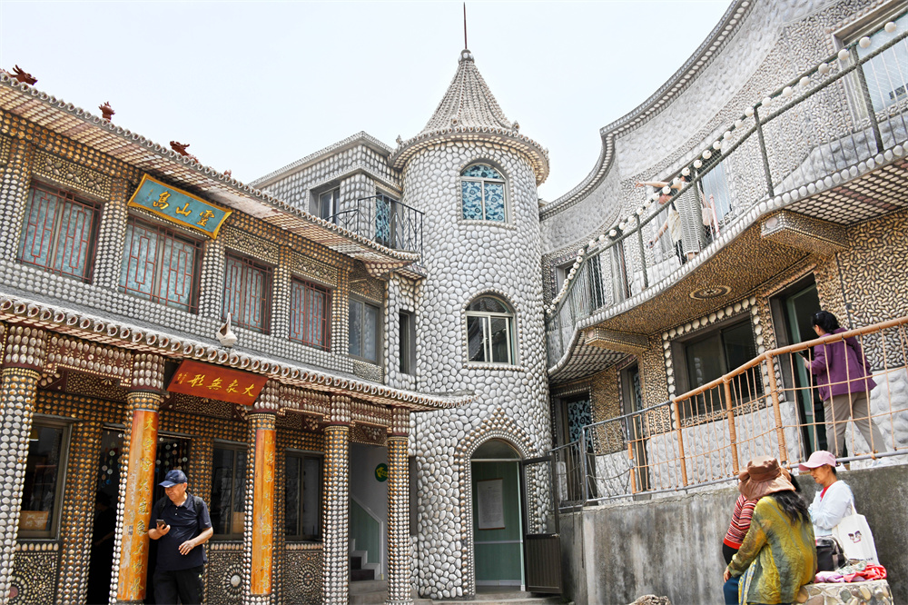 6月7日,游客在“贝壳楼”内参观。山东省青岛市灵山岛上有一座用各种贝壳装饰而成的“贝壳楼”,该建筑外墙、屋顶以及部分地面均采用贝壳装饰、镶嵌,其覆盖面积约1500平方米。据介绍,“贝壳楼”始建于1986年,历时20多年逐步完善而成。许多游客前来观光打卡。