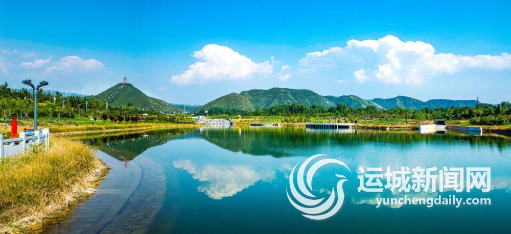 夏县白沙河生态公园与不远处的瑶台山交相辉映