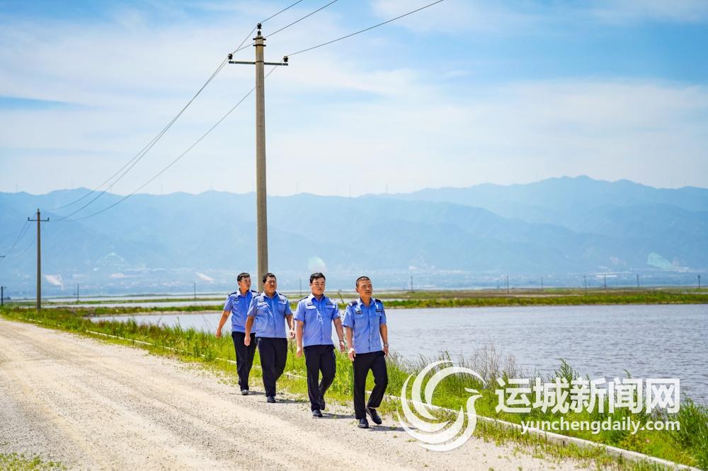 在盐湖的东南角,身着制服的四人巡逻小队,正顶着烈日巡护在盐湖周围。他们正是这幅水清人和画卷的守护者——盐湖巡护队。
