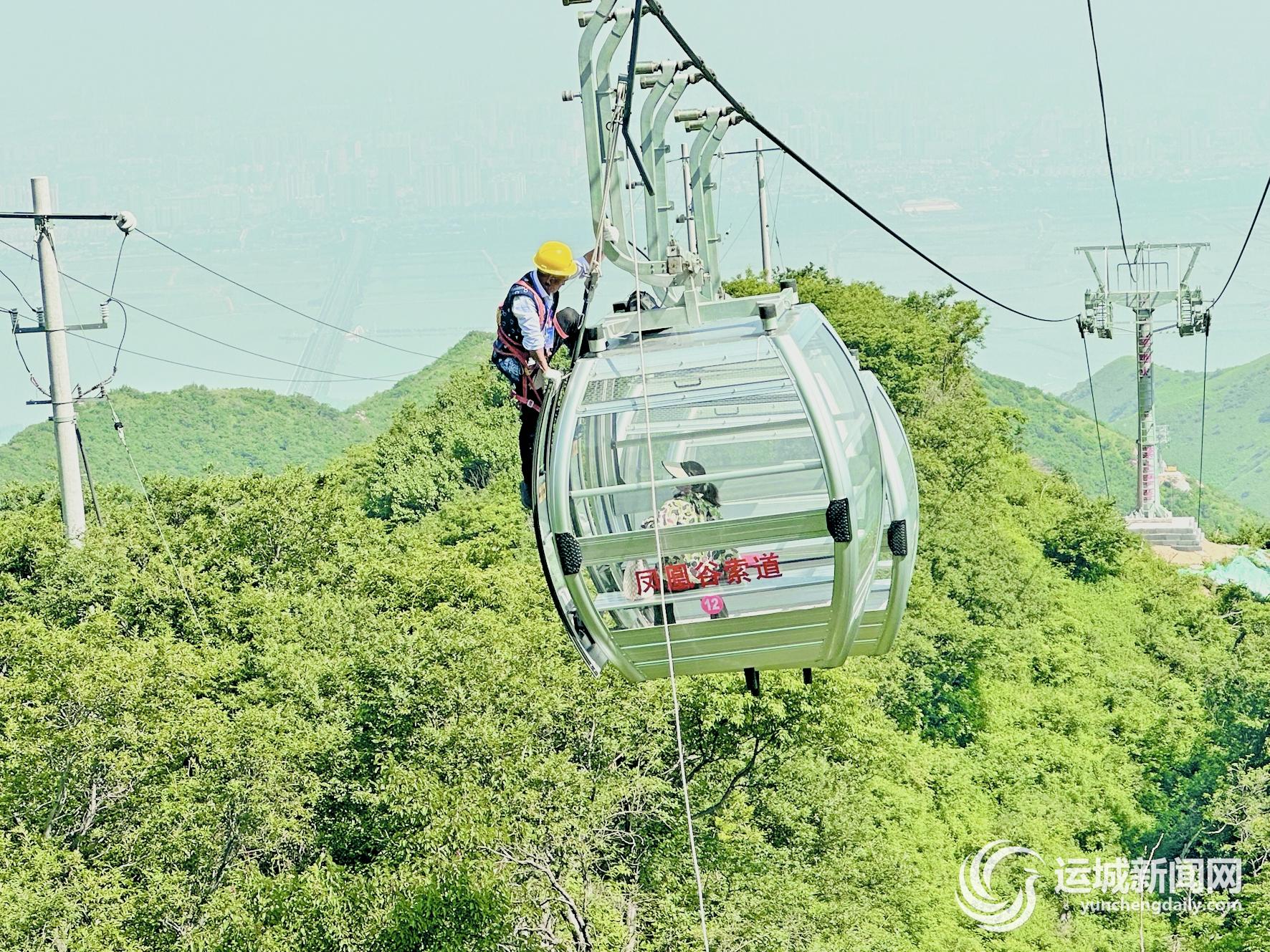 本次演练模拟凤凰谷索道突遇机械故障无法正常运行,1名乘客被困高空吊厢,指挥部迅速启动救援预案,先后采取高空垂直救援、水平救援措施。