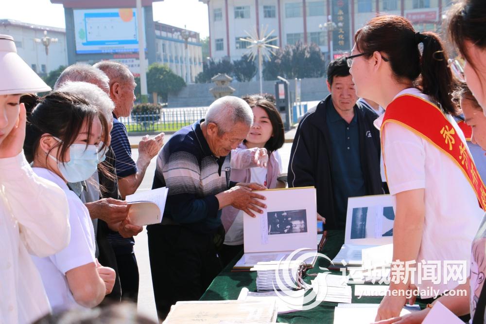图为永济市档案局、档案馆工作人员向群众发放宣传资料。