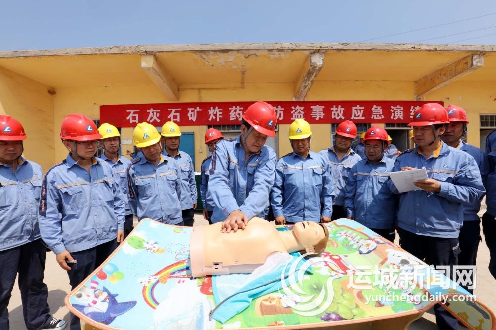 6月13日,河津市石灰石矿企业员工在进行心肺复苏应急演练。