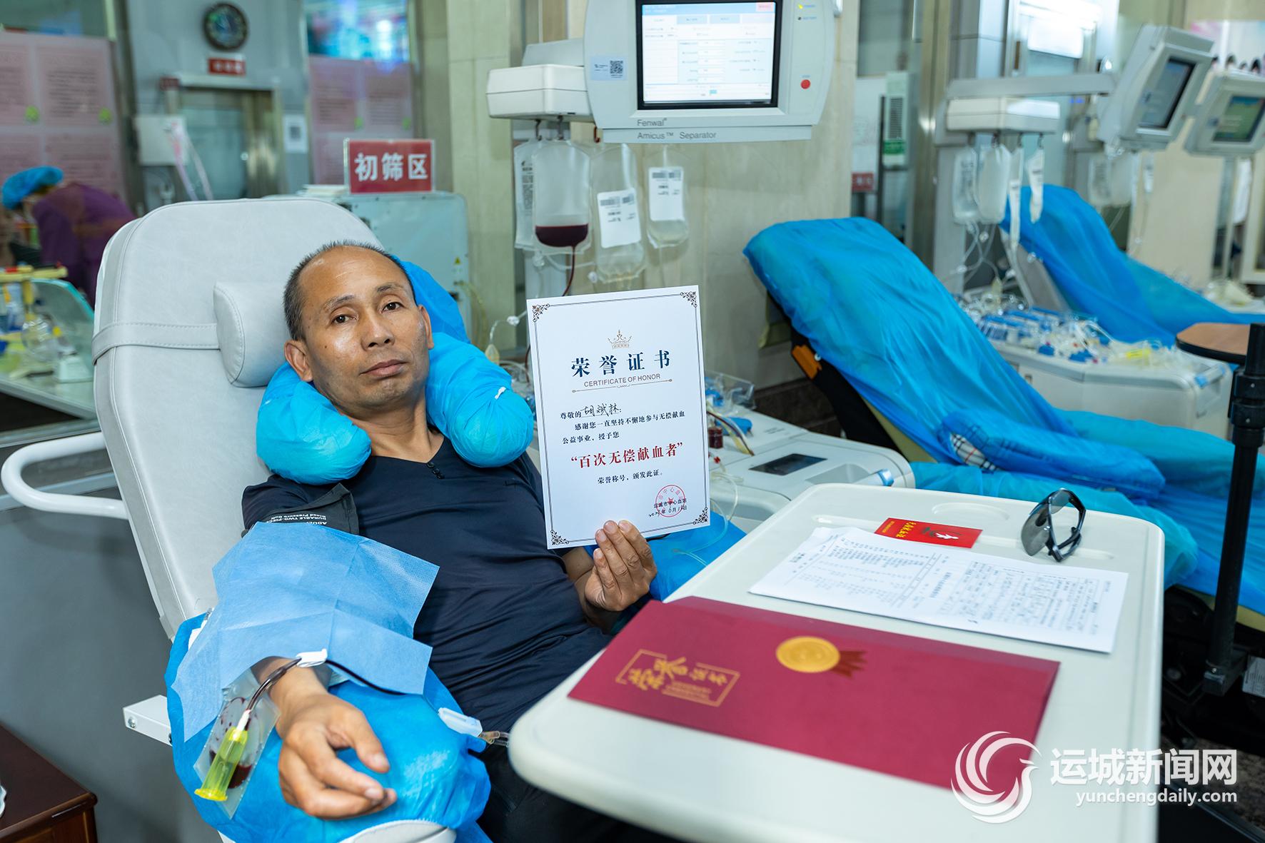 荣获“百次无偿献血者”的胡斌林在捐献成分血。