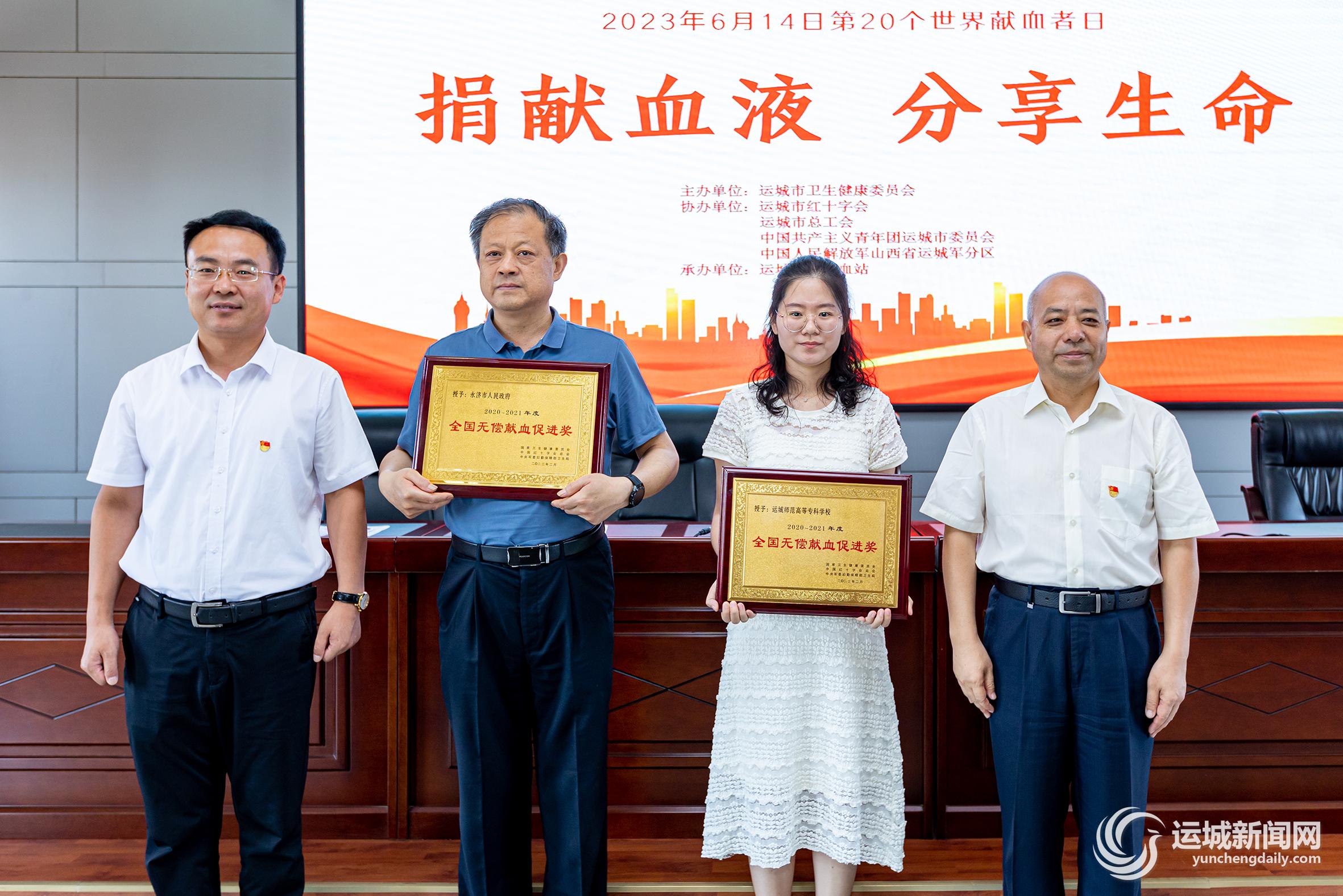 为荣获“全国无偿献血促进奖”的永济市人民政府、运城师范高等专科学校授牌。