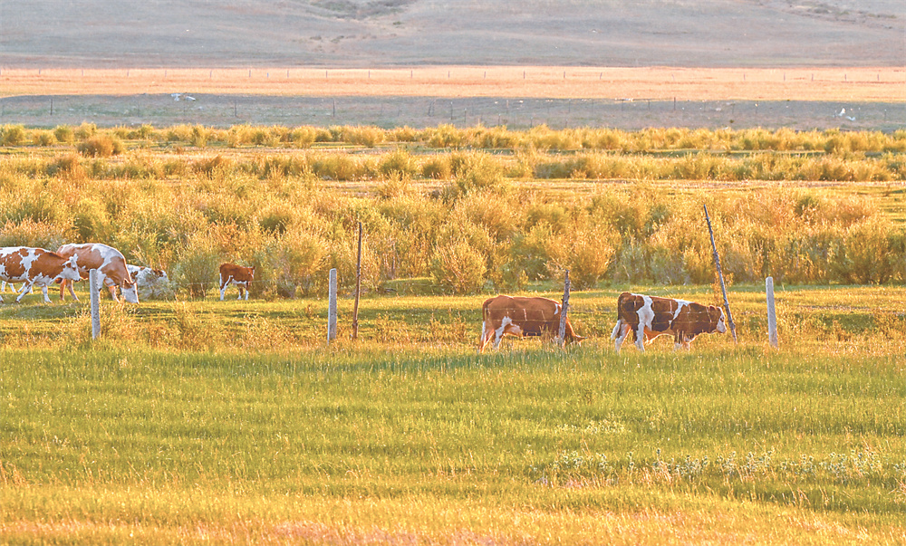 6月14日,牛群在草原上觅食。夏日,内蒙古阿鲁科尔沁草原绿意盎然,牛羊在草原上觅食,景色如画。 新华社记者 连 振 摄