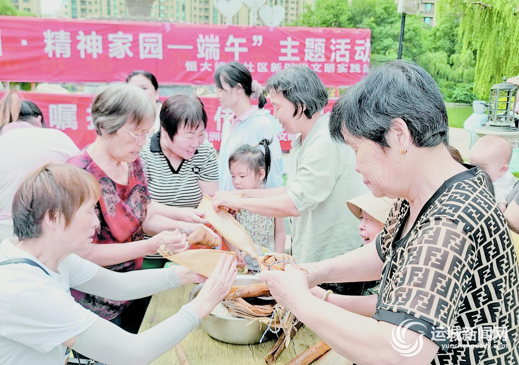 “这是给咱社区的粽叶、红枣和江米,还有丝线、棉花和香料。”上午9时许,该公司工作人员将相应的物品交给银湖街社区工作人员,并一同发放给现场参加活动的居民。拿到物品后,大家分头行动,一起包粽子、缝香包。居民宗吉莲说:“党和政府领导得好,全社会对老年人都很关心、照顾。今天在社区和大家一起过端午,热热闹闹,我非常开心。”在恒大绿洲小区,居民们围坐在一起,一边观看幼儿园小朋友表演的文艺节目,一边包粽子、煮粽子、做香包、拉家常,气氛十分融洽(下图)。