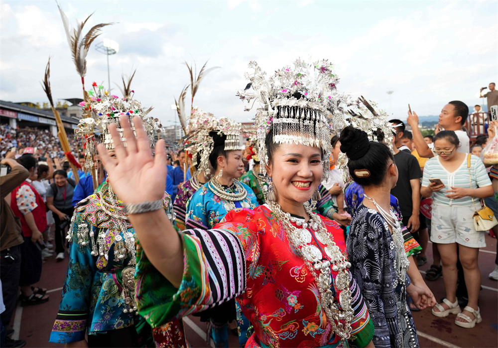 6月17日,在贵州“村超”足球赛开赛前,村民自发组成民族歌舞表演队盛装入场。
